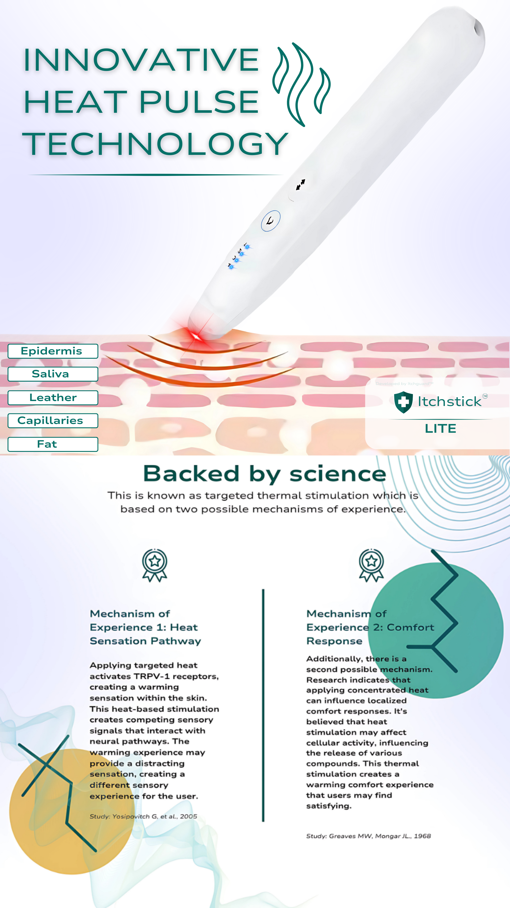 Personal Comfort: The Itchstick collection uses gentle warming pulses intended for cosmetic comfort and personal satisfaction. The Pro version includes a micro-suction tool for safely removing splinters, debris, and other small irritants from skin surfaces.