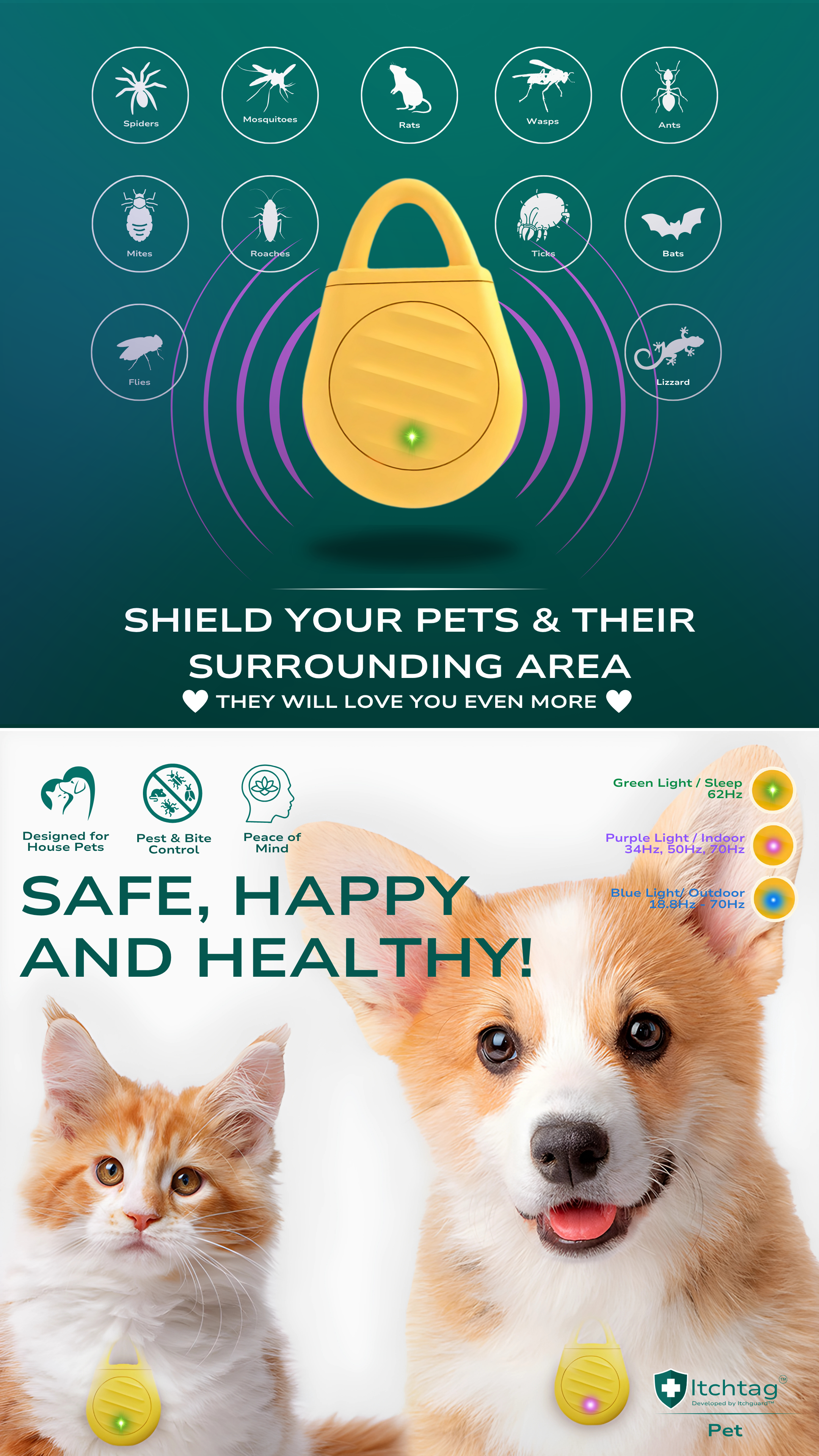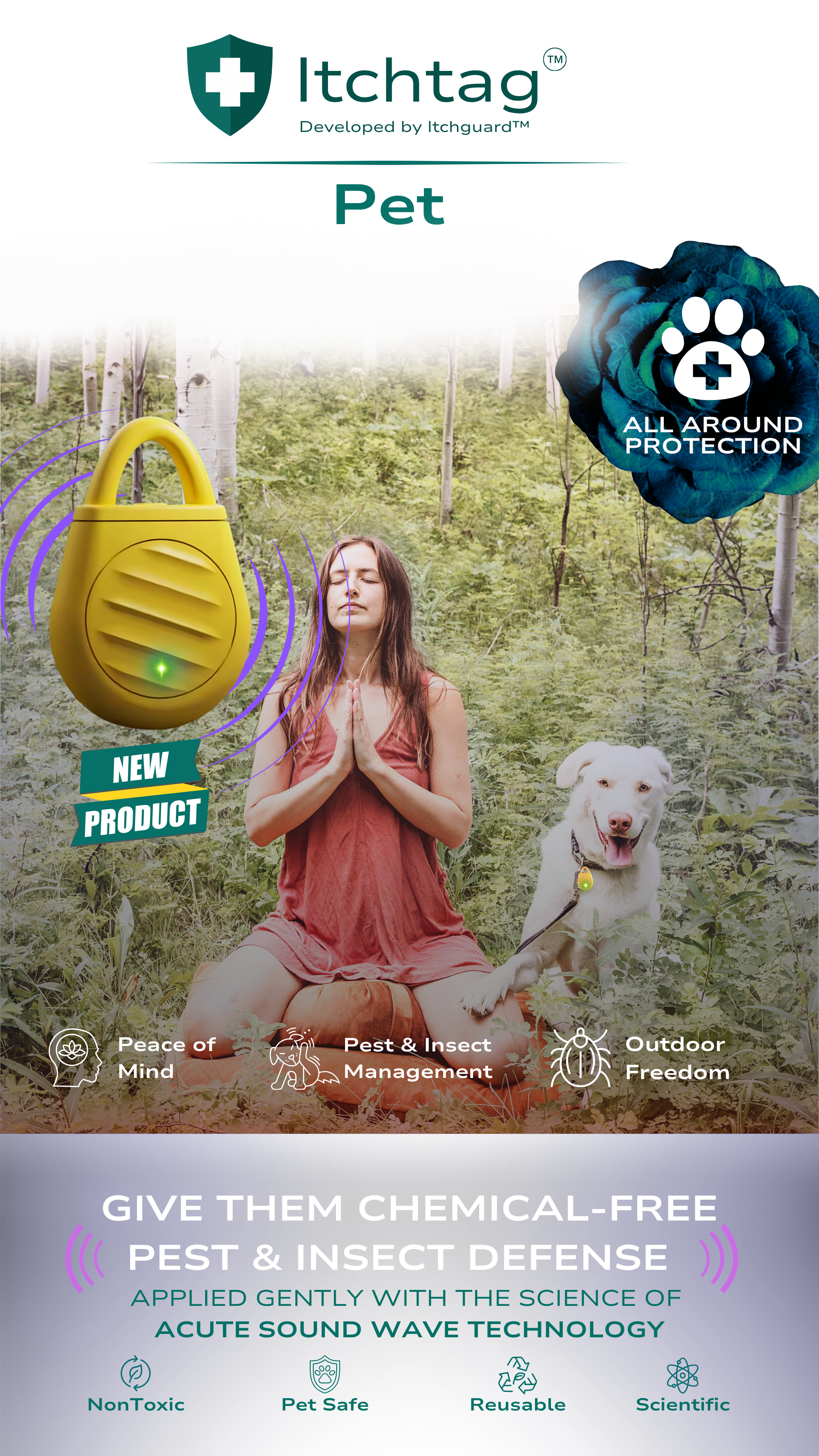 The Itchtag One and Itchtag Pet emit ultrasonic sound waves designed to modify your personal acoustic environment, helping you and your loved ones—both humans and pets—enjoy greater comfort indoors and outdoors.